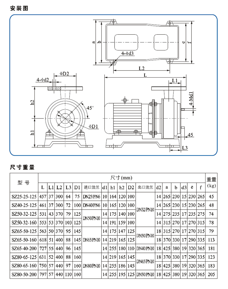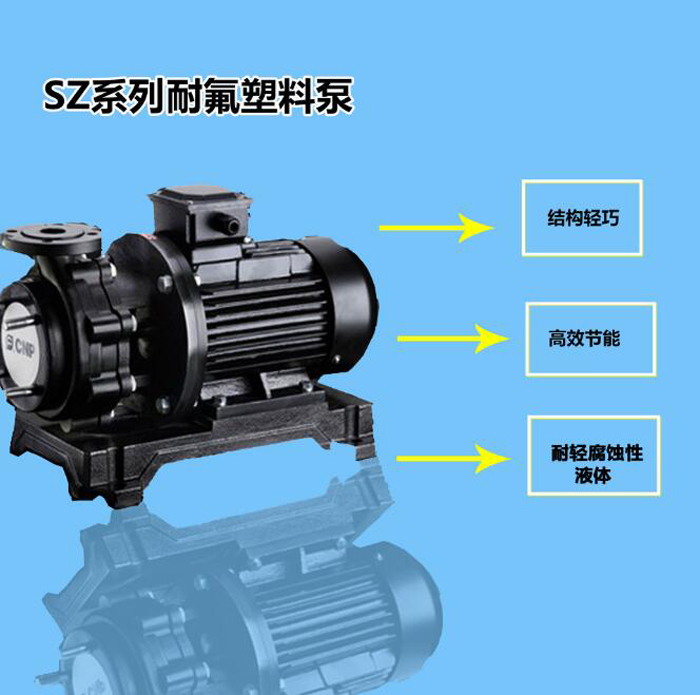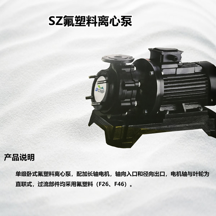 苏尔格SZ单级卧式氟塑料离心泵,配加长轴电机,轴向入口和径向出口,电机轴与叶轮为直联式,过流部件均采用氟塑料(F26、F46)。