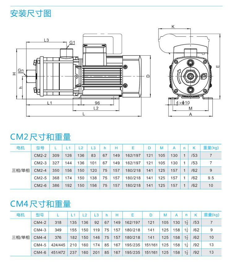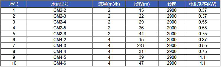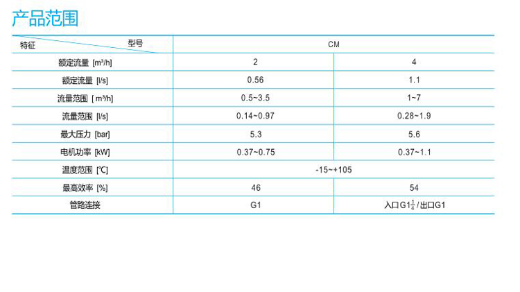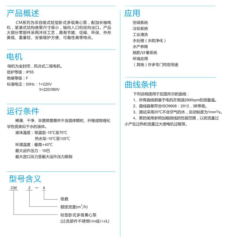 CM系列为非自吸式轻型卧式多级离心泵,配加长轴电机,紧凑式结构使泵尺寸很小,轴向入口和径向出口,产品大部分零件采用冲压工艺,具有节能、低噪、环保,外形美观、重量轻、安装维护方便、可靠性高等特点。