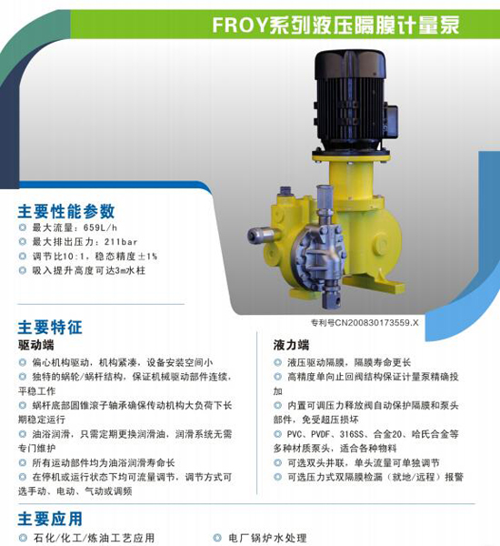 南方FROY系列液压隔膜计量泵:偏心机构驱动,机构紧凑,设备安装空间小。独特的蜗轮蜗杆结构,保证机械驱动部件连续、平稳工作。
