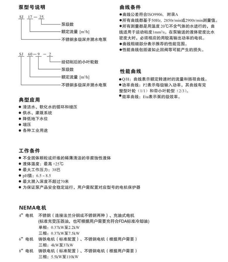 苏尔格SJ不锈钢多级深井潜水电泵配用潜水电机,替代传统长轴式联接的深井泵,泵内装有止回阀,以防止停机逆流及管路水锤对泵的冲击。